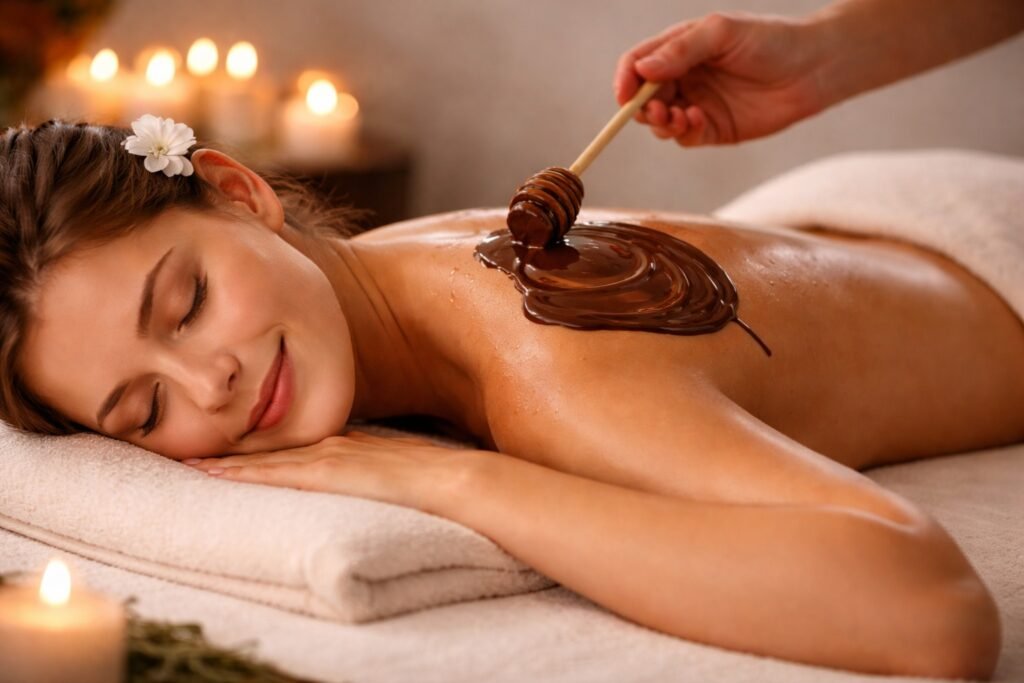 Indulge in a rich chocolate massage that nourishes your skin and relaxes your body.